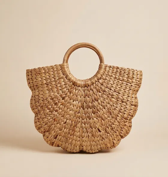 The Butterfly Shape Water Hyacinth Handbag is a beautifully handcrafted accessory made from natural water hyacinth fiber. Designed with elegant scalloped edges resembling butterfly wings and a smooth round wooden handle, this eco-friendly bag combines traditional craftsmanship with stylish charm.