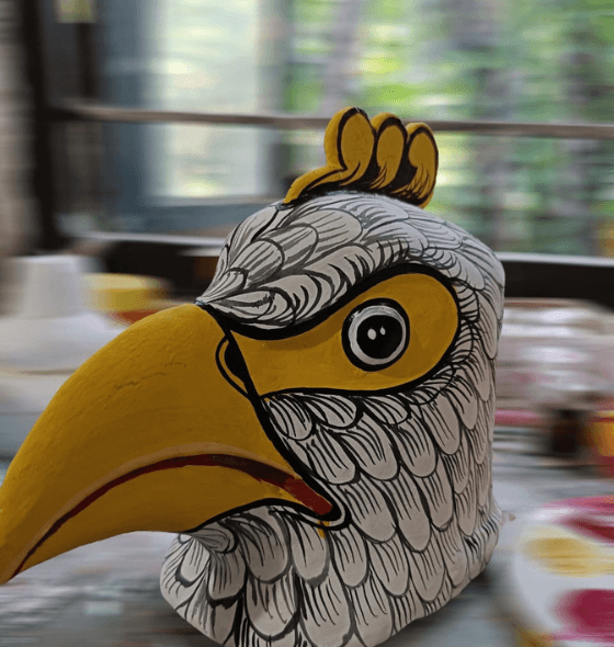 • Traditional technique: Artisans construct a 3D bamboo framework, cover it with clay-coated cotton cloth, and apply layers of a clay–cow dung mixture to sculpt and refine the facial features. After drying, the mask is painted with natural pigments and finished with decorative details.