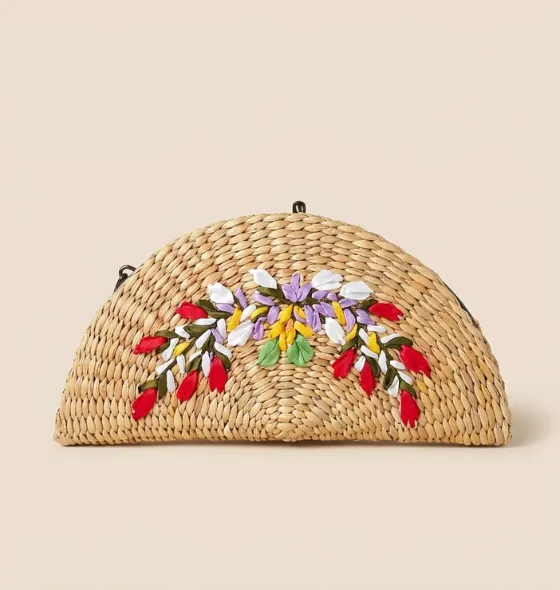 Designed in an elegant half-moon shape, the clutch has a firm woven structure that keeps your belongings safe while maintaining a lightweight and comfortable feel. The natural woven texture is complemented by colorful floral embroidery on the front, featuring delicate purple, yellow, red, and green accents that bring the design to life.