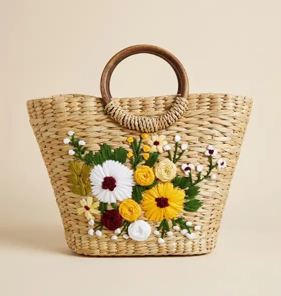 This basket-style bag features a strong woven structure with a comfortable circular handle that makes it easy to carry while shopping or traveling. The natural woven texture gives the bag a warm, earthy appeal, while the front panel is beautifully decorated with colorful floral embroidery in shades of white, yellow, red, and green. This detailed embroidery adds elegance and a lively touch to the bag.
