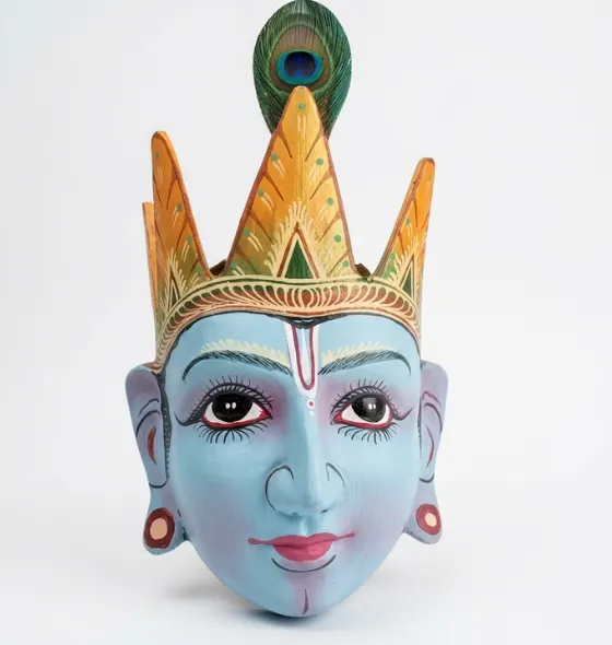 The mask represents Lord Krishna, often called Shyam because of his distinctive blue complexion. Krishna is revered as a symbol of divine love, wisdom, and righteousness. The mask usually features a serene blue face, gentle smile, expressive eyes, and a decorative crown adorned with a peacock feather, which is one of Krishna’s most recognizable symbols.