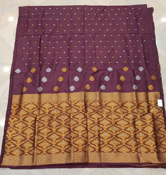 The saree features intricate golden guna work that creates elegant motifs across the fabric, complemented by a richly designed golden border. The deep brown base combined with the golden patterns gives the saree a graceful and sophisticated look, making it perfect for weddings, festivals, cultural events, and special celebrations.